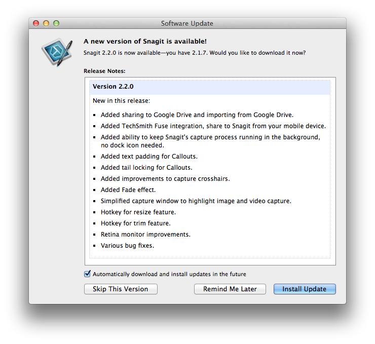 Snagit 2.2.0 UpdateSnagit has been my “go to” app for on OS X for all things screen capture. This update adds some nice features that I have been asking for. Snagit in combination with Camtasia 2 for screencasts are the most used tools now in my “educators toolbox”.
