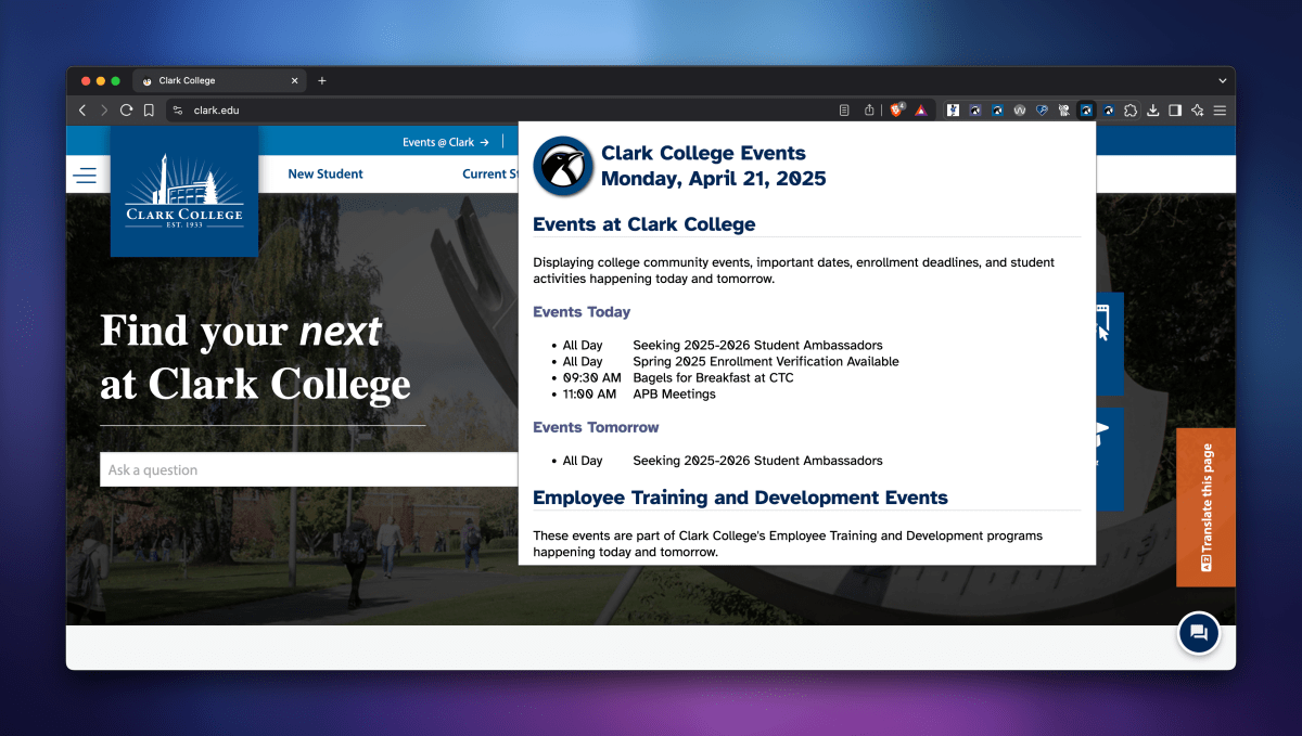 After carving out an hour (okay, maybe two), I built a Clark College Events browser extension that does one thing really well: shows you all of today and tomorrow’s events in one clean, easy-to-read place.
