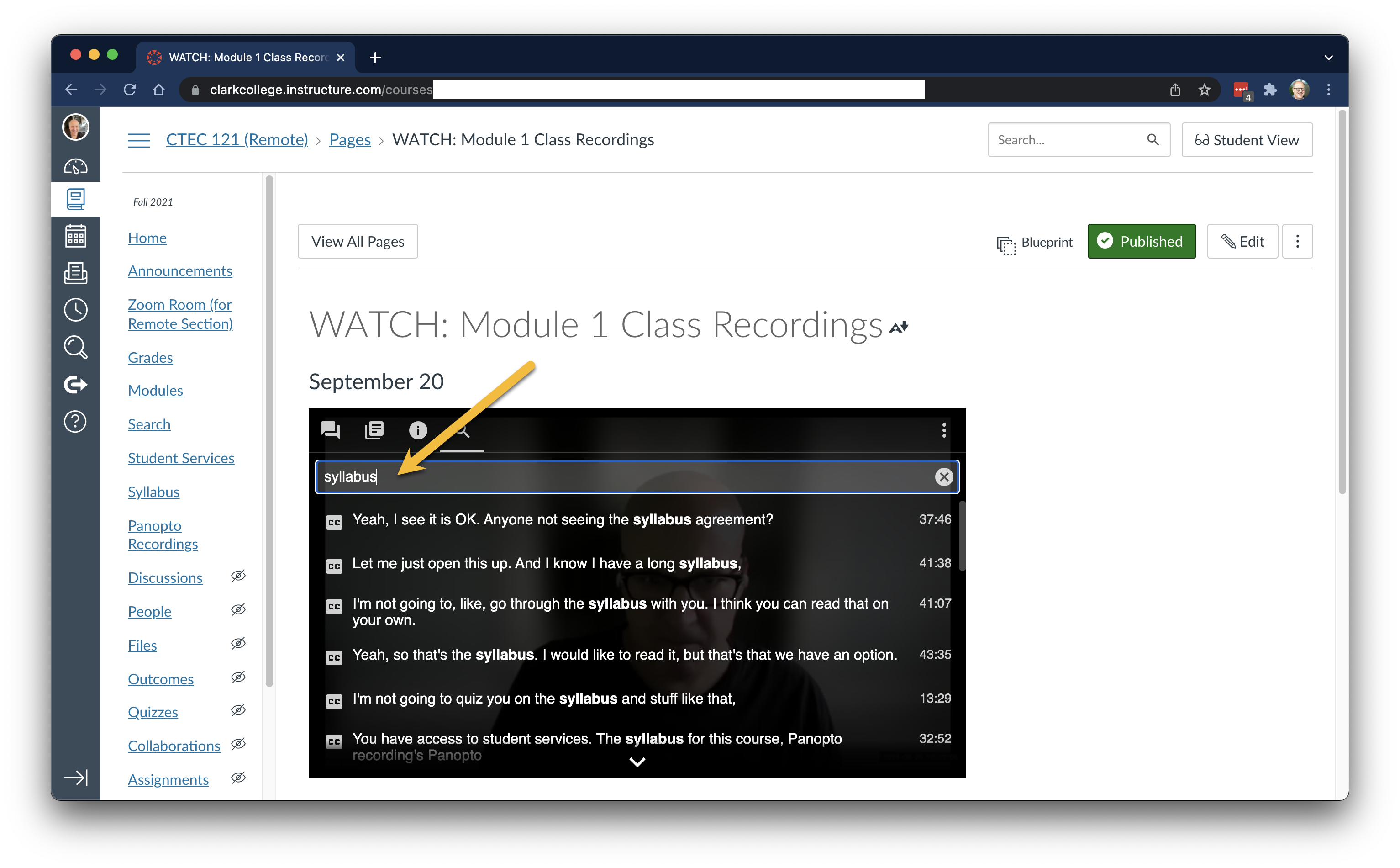 I just learned that the embedded Paqnopto video player that’s used in Canvas at Clark College allows you to search for transcribed text.