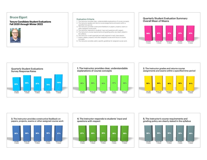 Last week I received the evaluations that students filled out towards the end of the Winter 2022 quarter. I’ve been keeping a graph of the data and wanted to share it. Tenure-Track candidates at Clark College are evaluated every quarter.